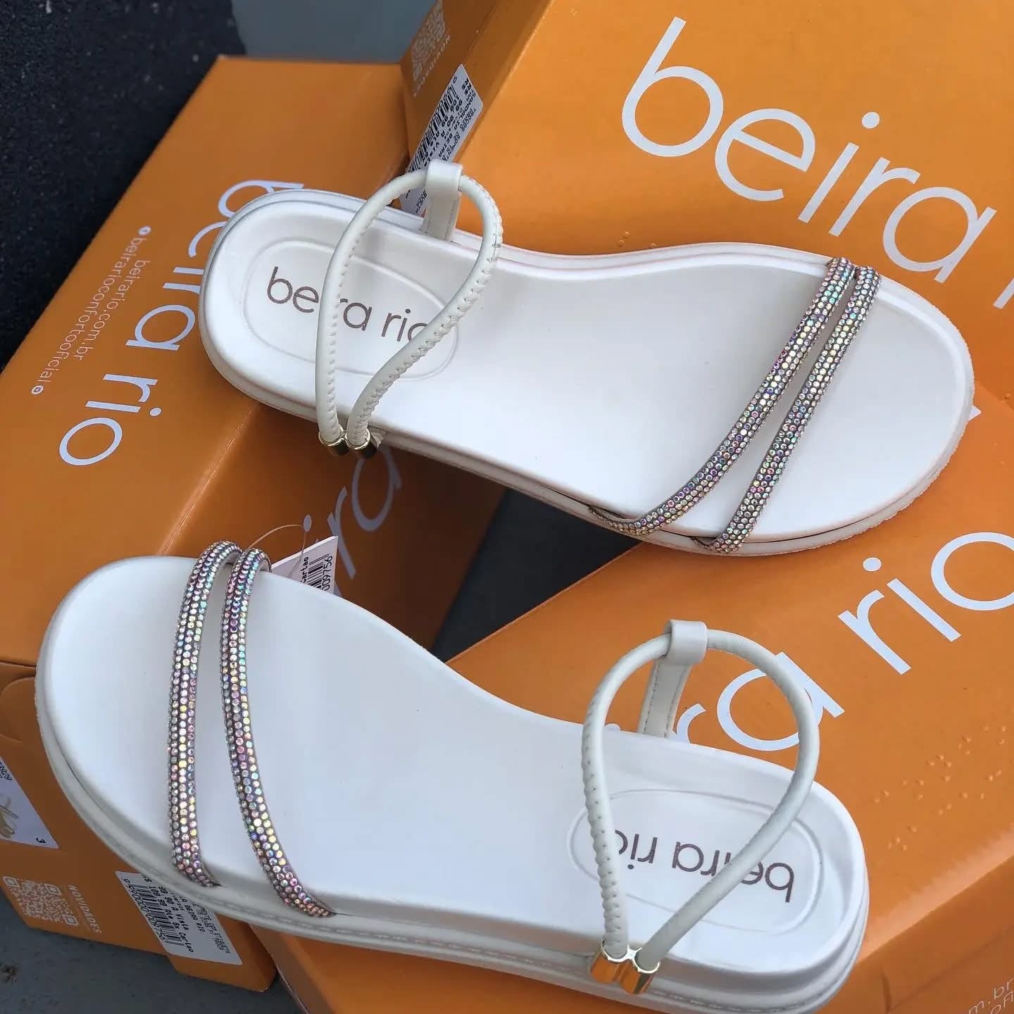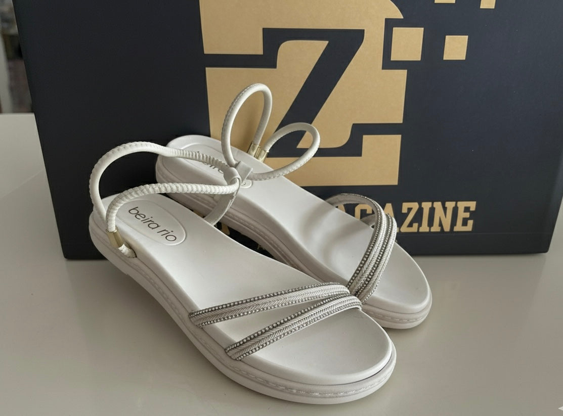 Esta sandália da Beira Rio, disponível na Zoppi Magazine, é a definição de sofisticação prática. O modelo se destaca pelo contraste entre a pureza do branco (off-white) e o brilho intenso das tiras frontais.