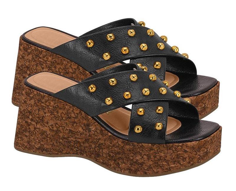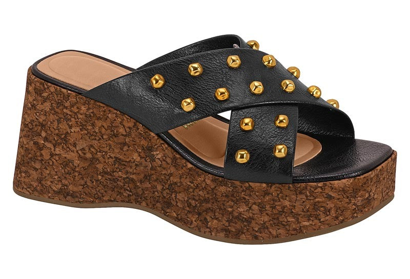 Sandália Tamanco Plataforma com Tachas e Douradas e Salto Cortiça Ref:115745