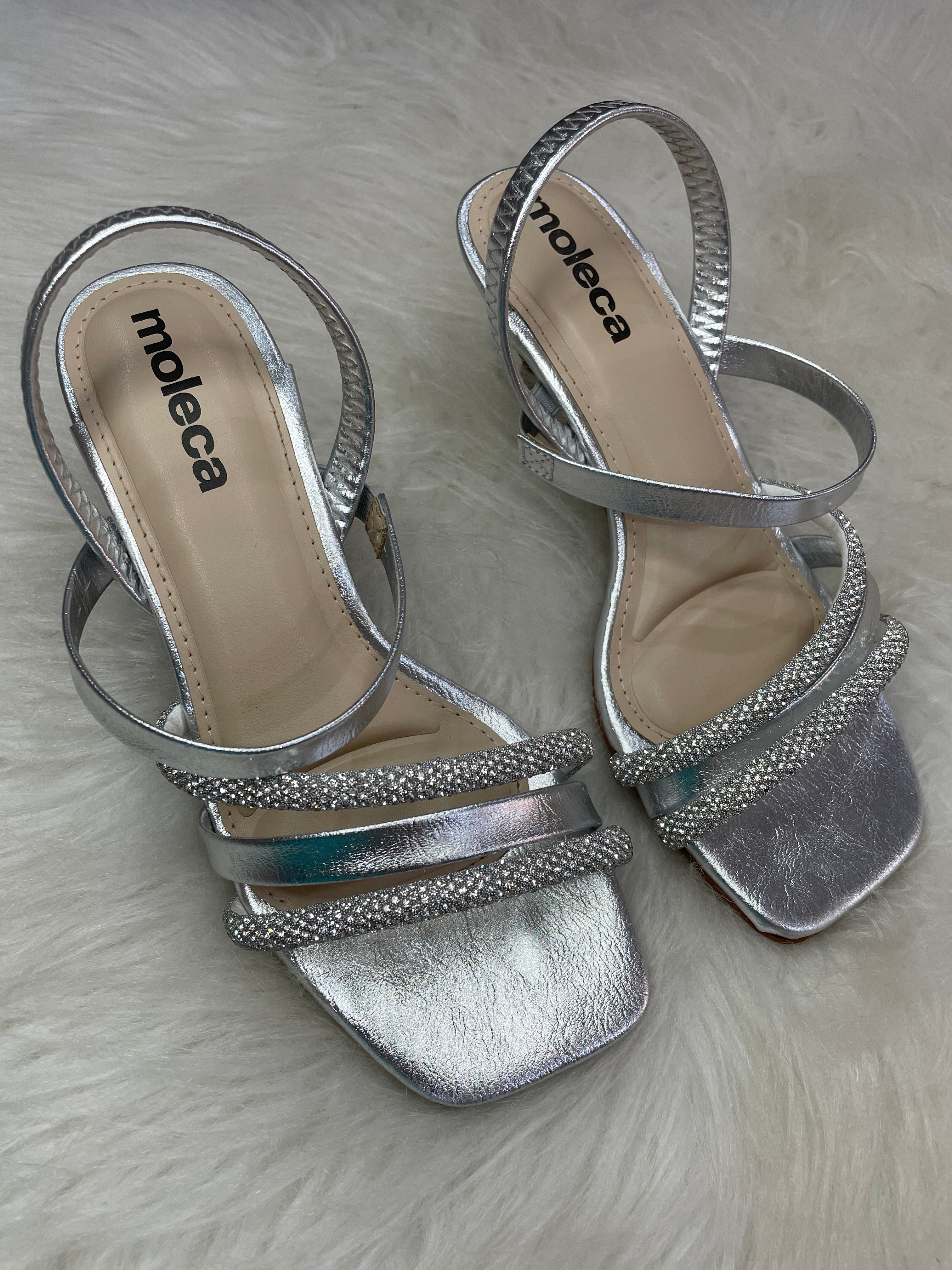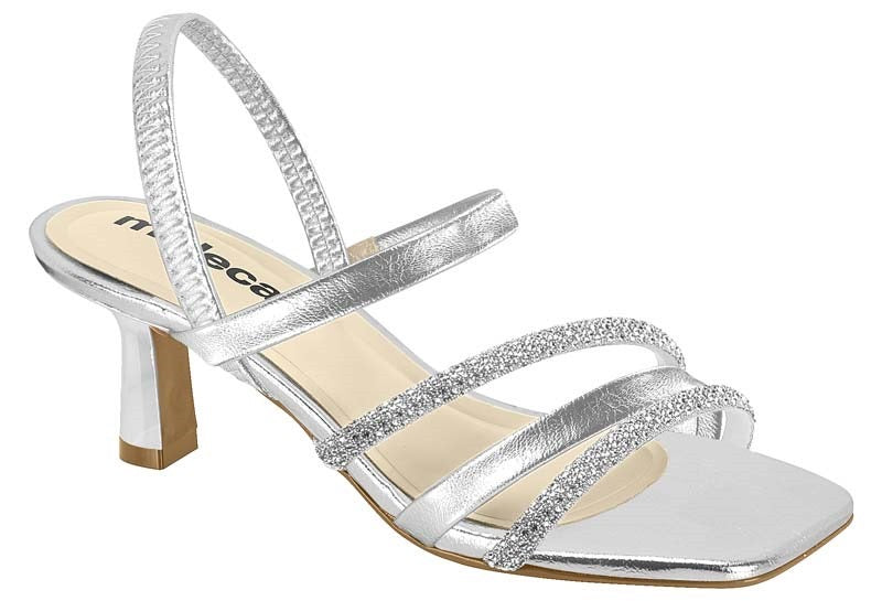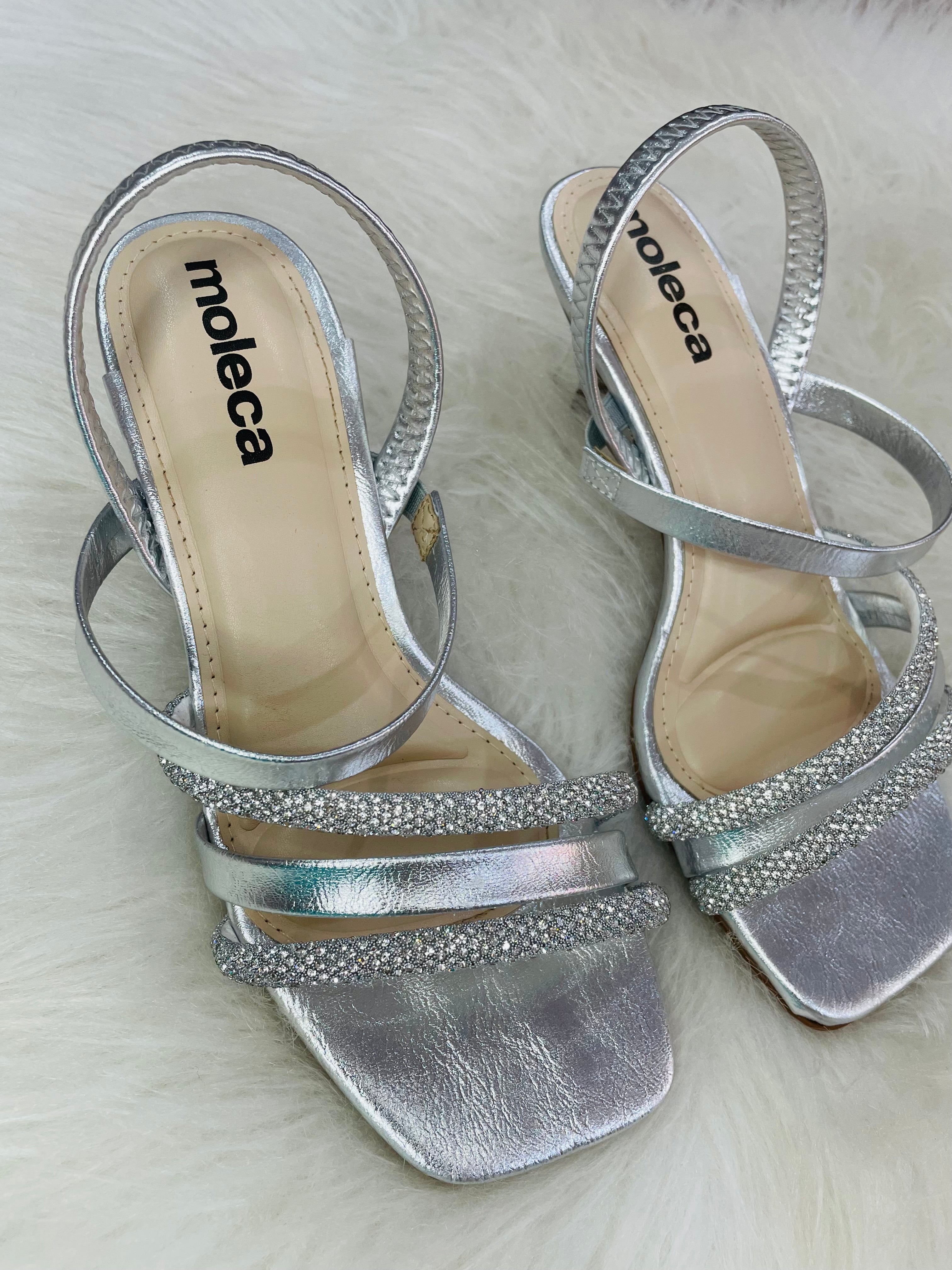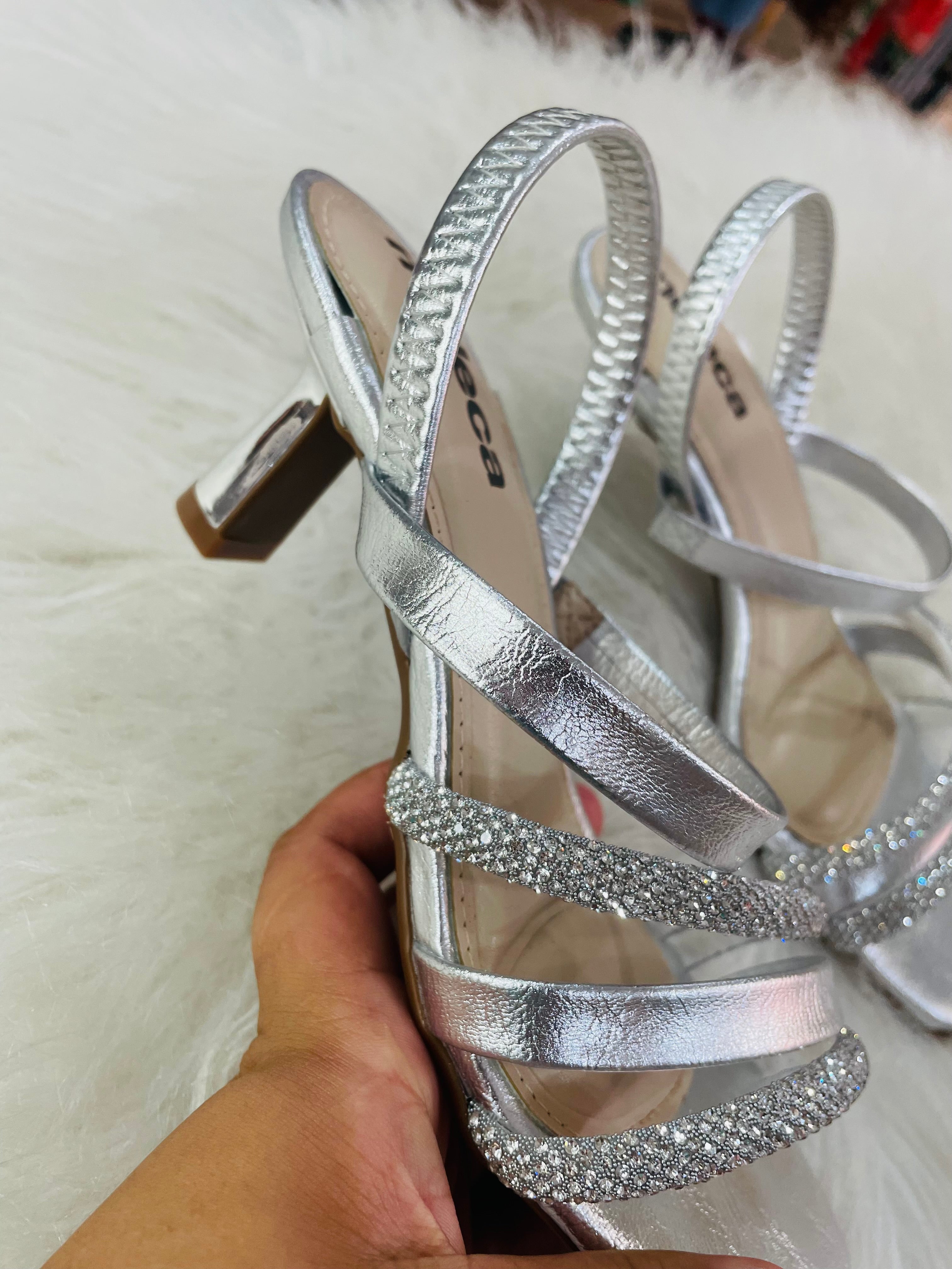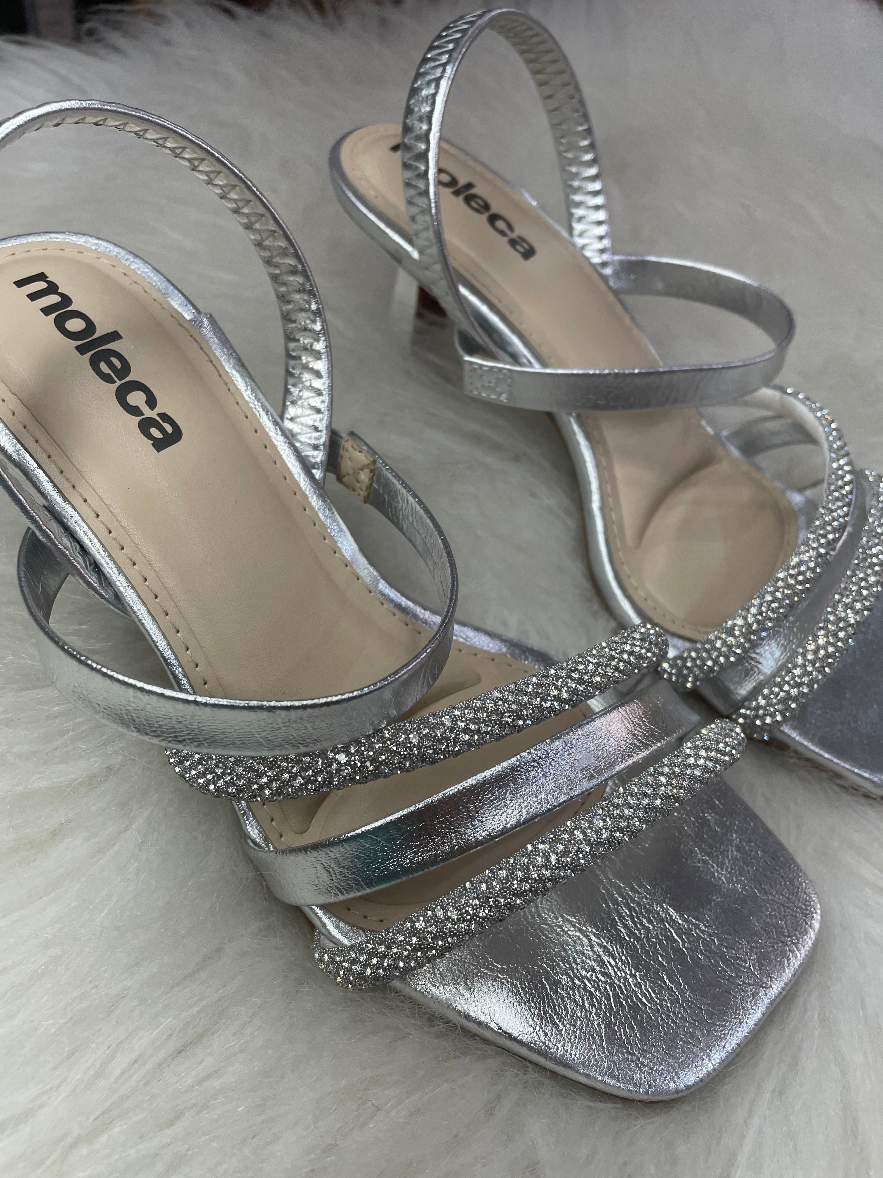 • Design de Tiras: O modelo conta com múltiplas tiras frontais, destacando-se duas delas inteiramente revestidas em brilho (glitter/strass), que garantem um ponto de luz sofisticado ao visual.