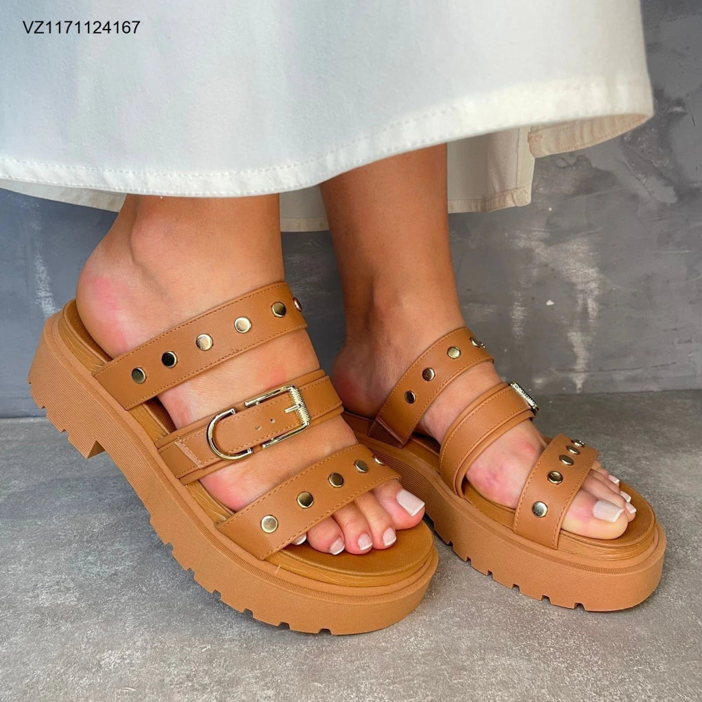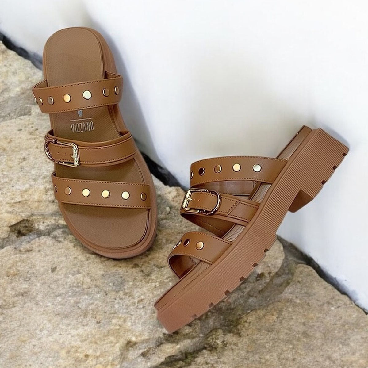 • Riqueza nos Detalhes: Suas tiras são adornadas com tachas douradas e uma fivela central ajustável, trazendo um brilho sofisticado ao tom caramelo clássico.