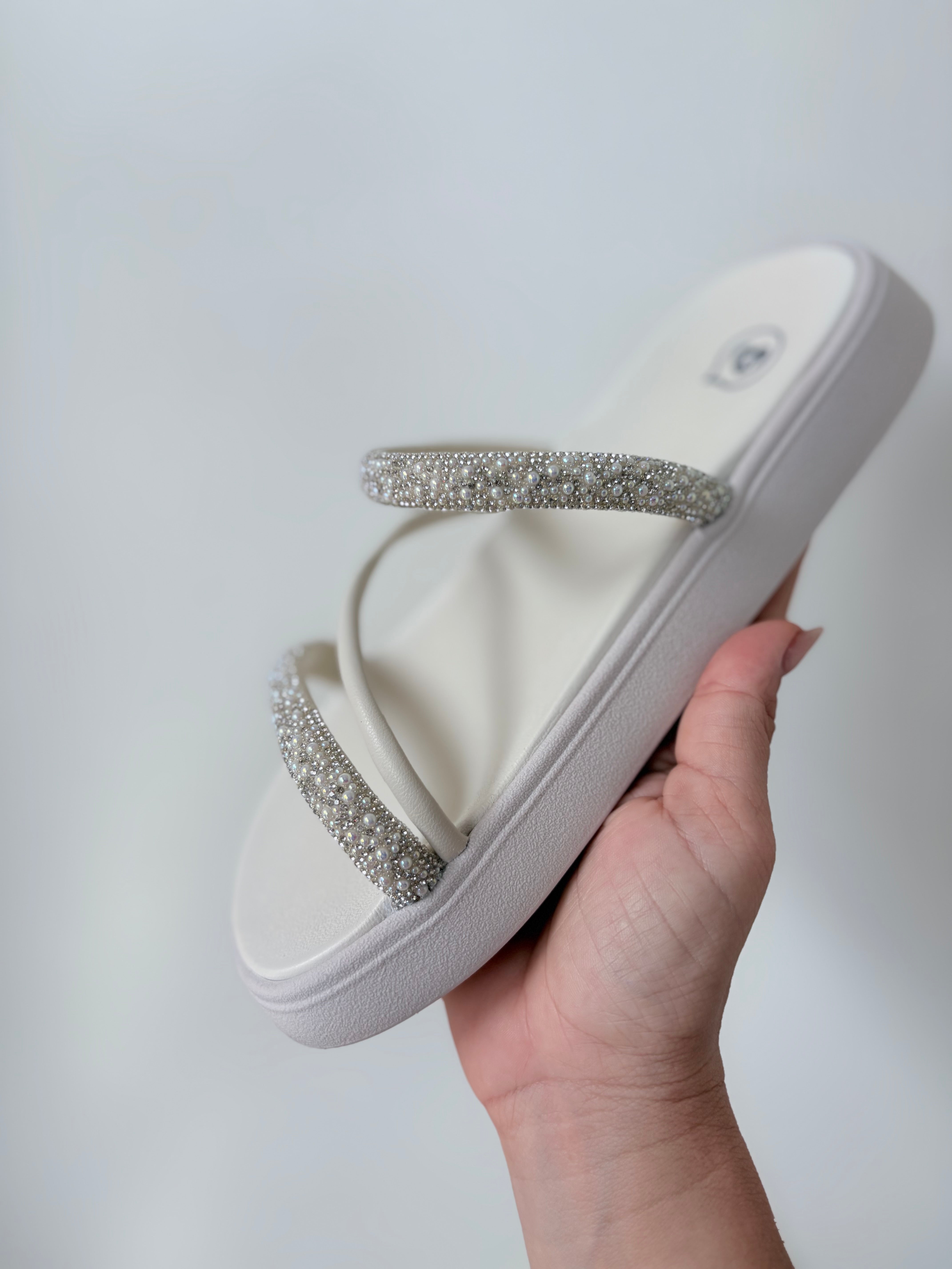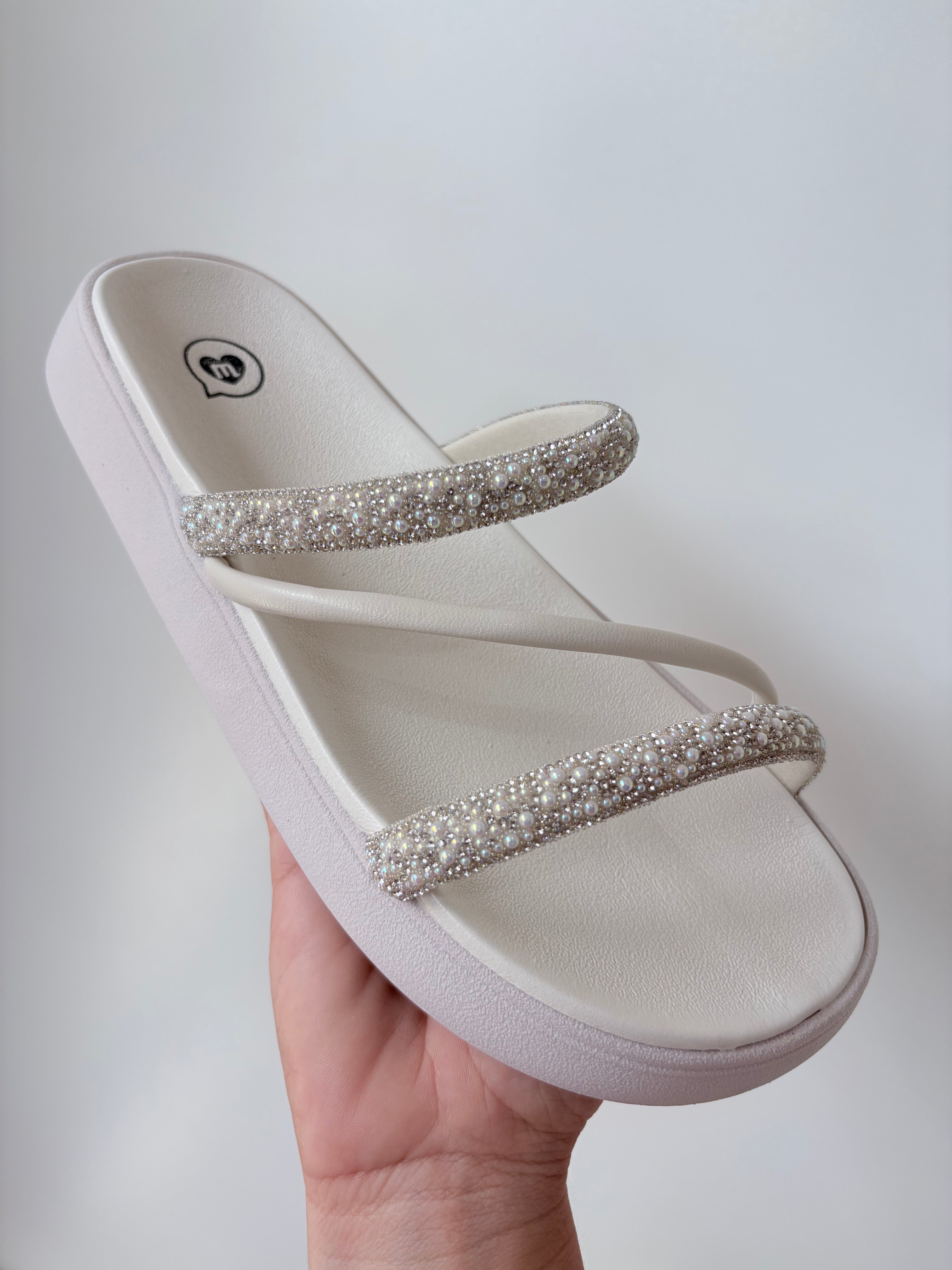A união perfeita entre o conforto absoluto da sola tratorada leve e o glamour dos detalhes feitos à mão. Esta papete é ideal para quem quer brilhar sem abrir mão do bem-estar. As tiras delicadamente cravejadas com micro-pérolas e strass trazem uma sofisticação imediata para os looks casuais de verão.