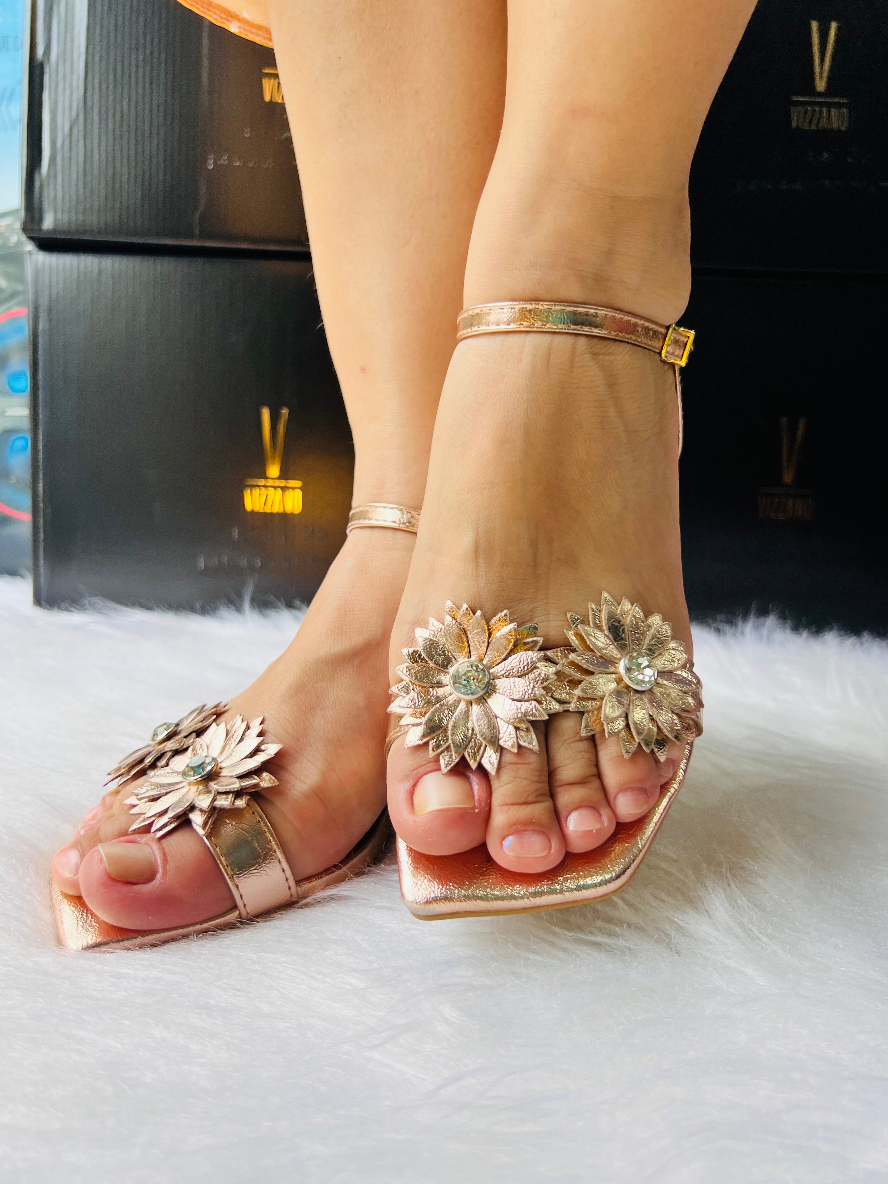 Aposte no glamour irresistível da nova coleção Vizzano. Esta sandália une a sofisticação do acabamento metalizado com o romantismo das aplicações florais em relevo. O grande diferencial fica por conta do centro das flores com aplicação de strass, garantindo um brilho sutil e elegante a cada passo.